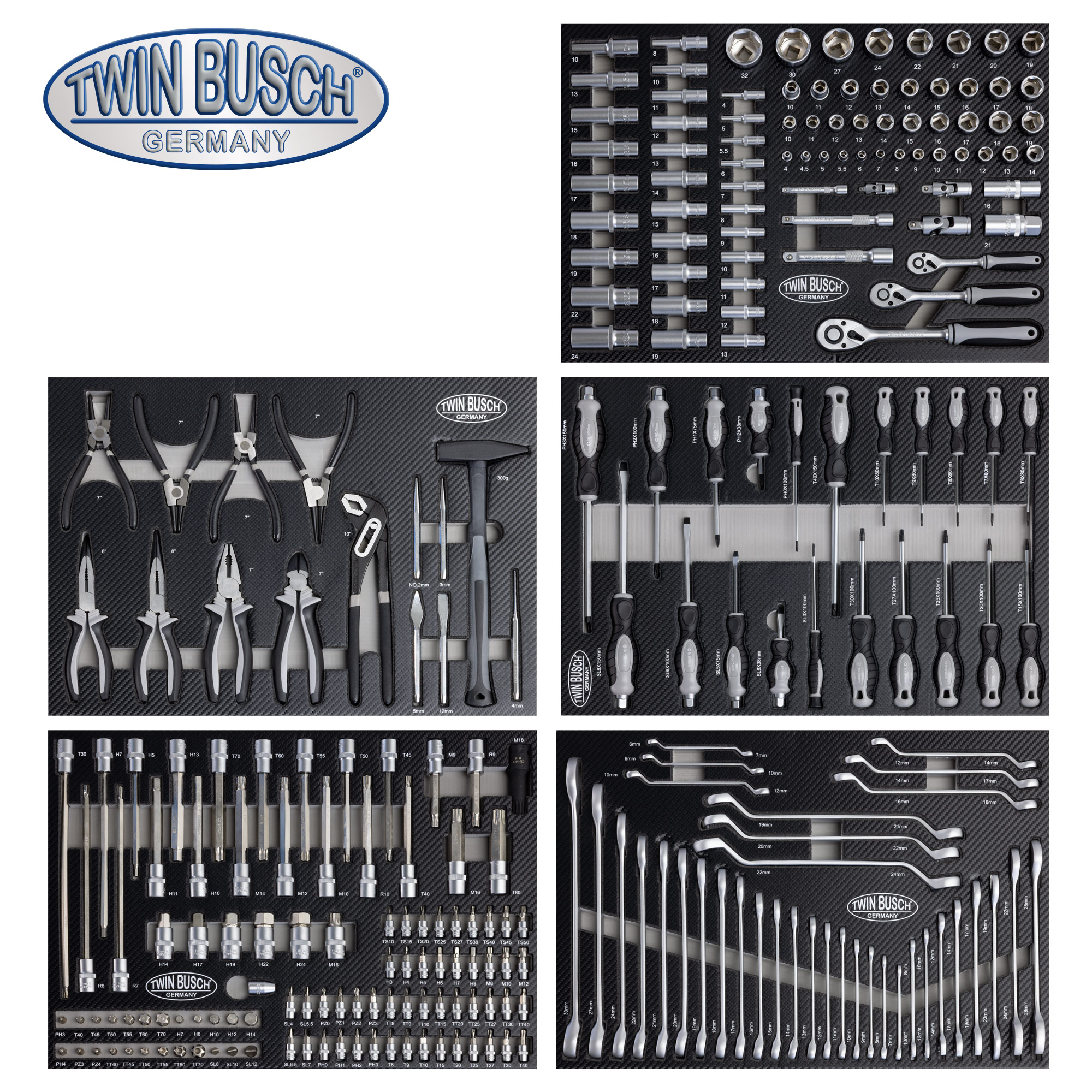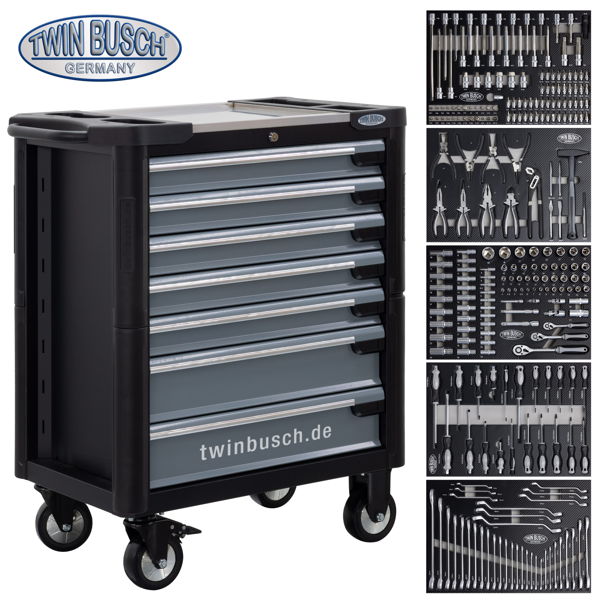 Solidny wózek narzędziowy z siedmioma szufladami na łożyskach kulkowych zachwyca przemyślaną funkcjonalnością, wysoką nośnością i maksymalnym bezpieczeństwem. Pięć szuflad jest wyposażonych w wysokiej jakości narzędzia, w tym zestaw nasadek, zestaw kluczy francuskich w rozmiarach od 6 mm do 30 mm, zestaw kluczy imbusowych, zestaw kluczy Torx, zestaw wkrętaków, zestaw szczypiec, młotek i wiele innych. Dzięki temu wózek jest gotowy do natychmiastowego użycia i oferuje wszechstronne wyposażenie podstawowe do codziennego użytku.