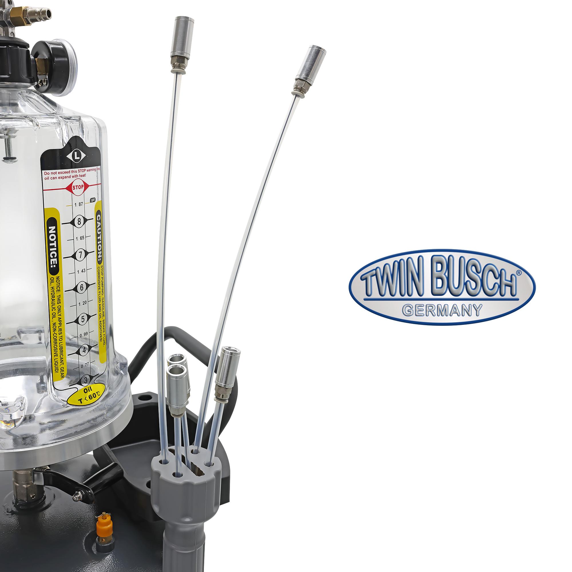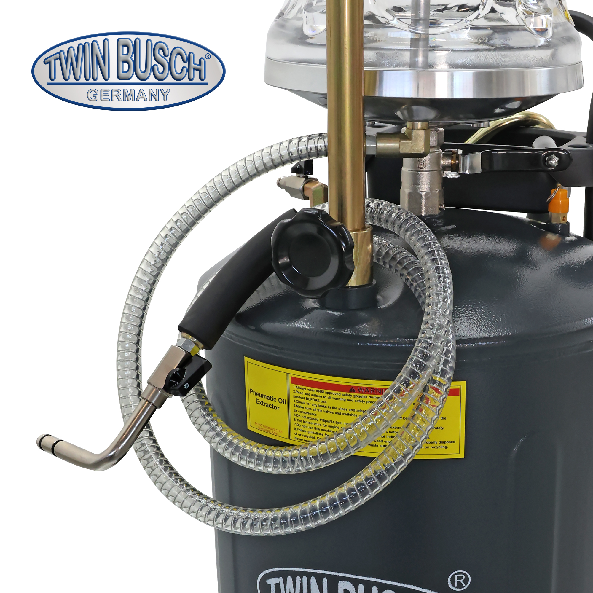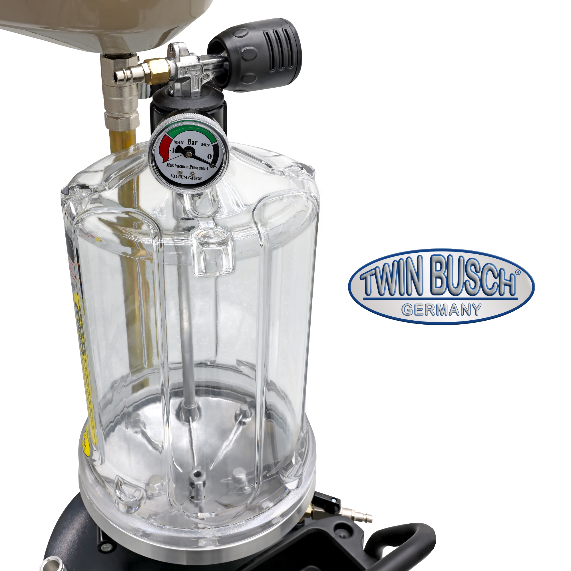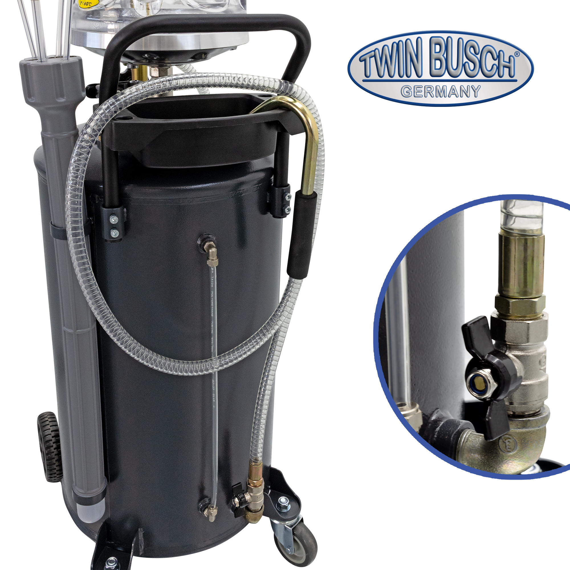 TW21950-G to wydajny pojemnik do zbierania i odsysania oleju, przeznaczony do profesjonalnych warsztatów. Dzięki dużej pojemności 70 litrów oferuje wystarczającą pojemność do intensywnych prac. Zintegrowany, szklany pojemnik pomiarowy o pojemności 10 litrów umożliwia precyzyjne, wizualne monitorowanie odsysanego oleju – idealne rozwiązanie do diagnostyki i dokumentacji. Tacka ociekowa na filtry oleju ułatwia opróżnianie, a zintegrowany zawór bezpieczeństwa zapewnia dodatkowe bezpieczeństwo. W zależności od zastosowanej dyszy, funkcja odsysania osiąga wydajność ssania 1-2 litrów na minutę, zapewniając wydajną i czystą pracę. Wymagane jest ciśnienie robocze 8-10 barów. Opróżnianie jest wygodne i czyste za pomocą sprężonego powietrza.